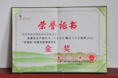 “隨峰、神農(nóng)益木牌隨州芽茶”榮獲2012 “中綠杯”中國名優(yōu)綠茶評(píng)比“金獎(jiǎng)”